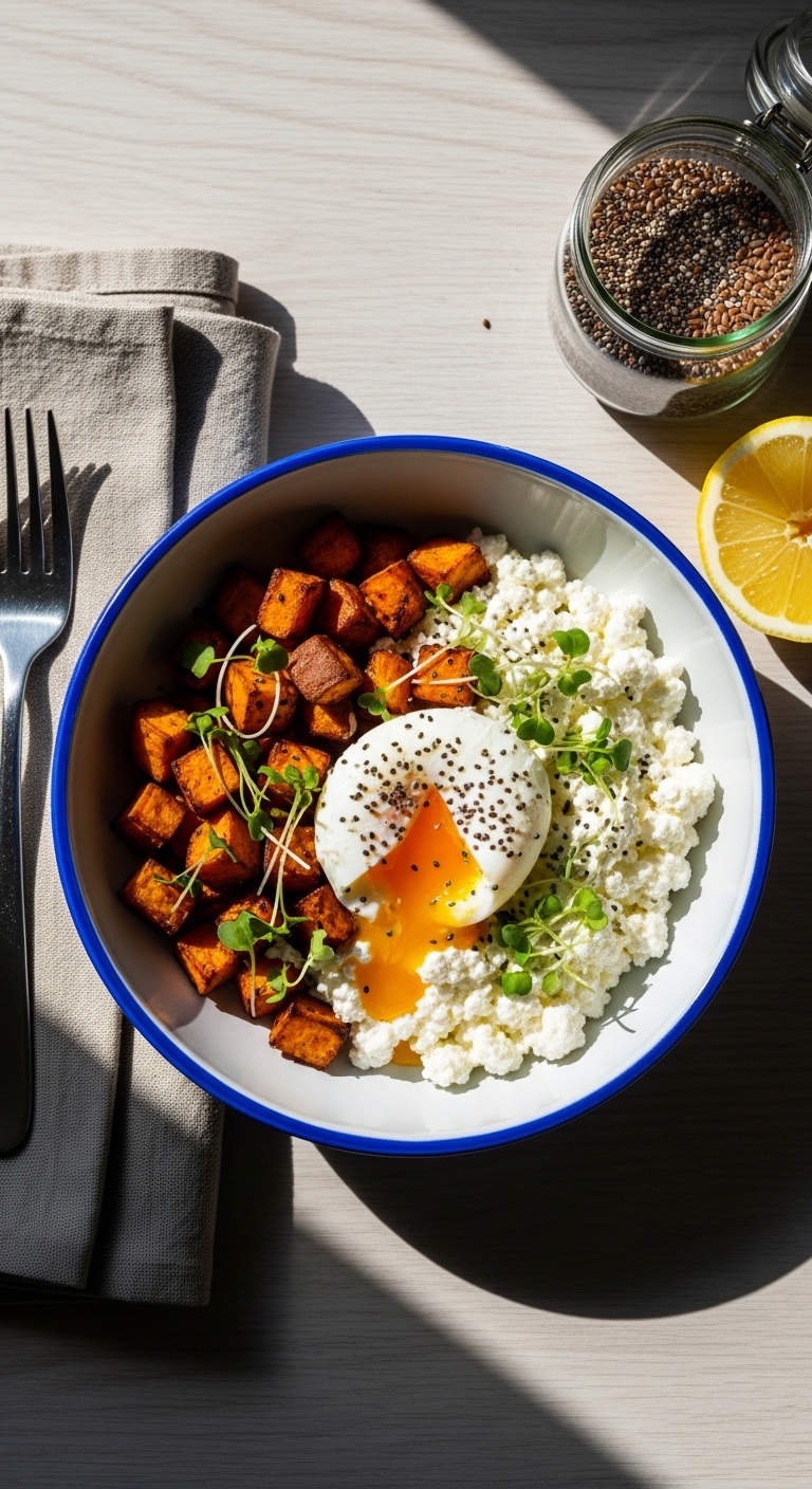 This power bowl layers creamy cottage cheese with a perfectly poached egg for a satisfying protein combo. Texture ranges from velvety cheese to runny yolk and crisp roasted sweet potato. It’s high in casein and egg protein, so it supports muscle recovery. You’ll appreciate the balance of savory and earthy flavors, plus the fresh lemon brightness.
