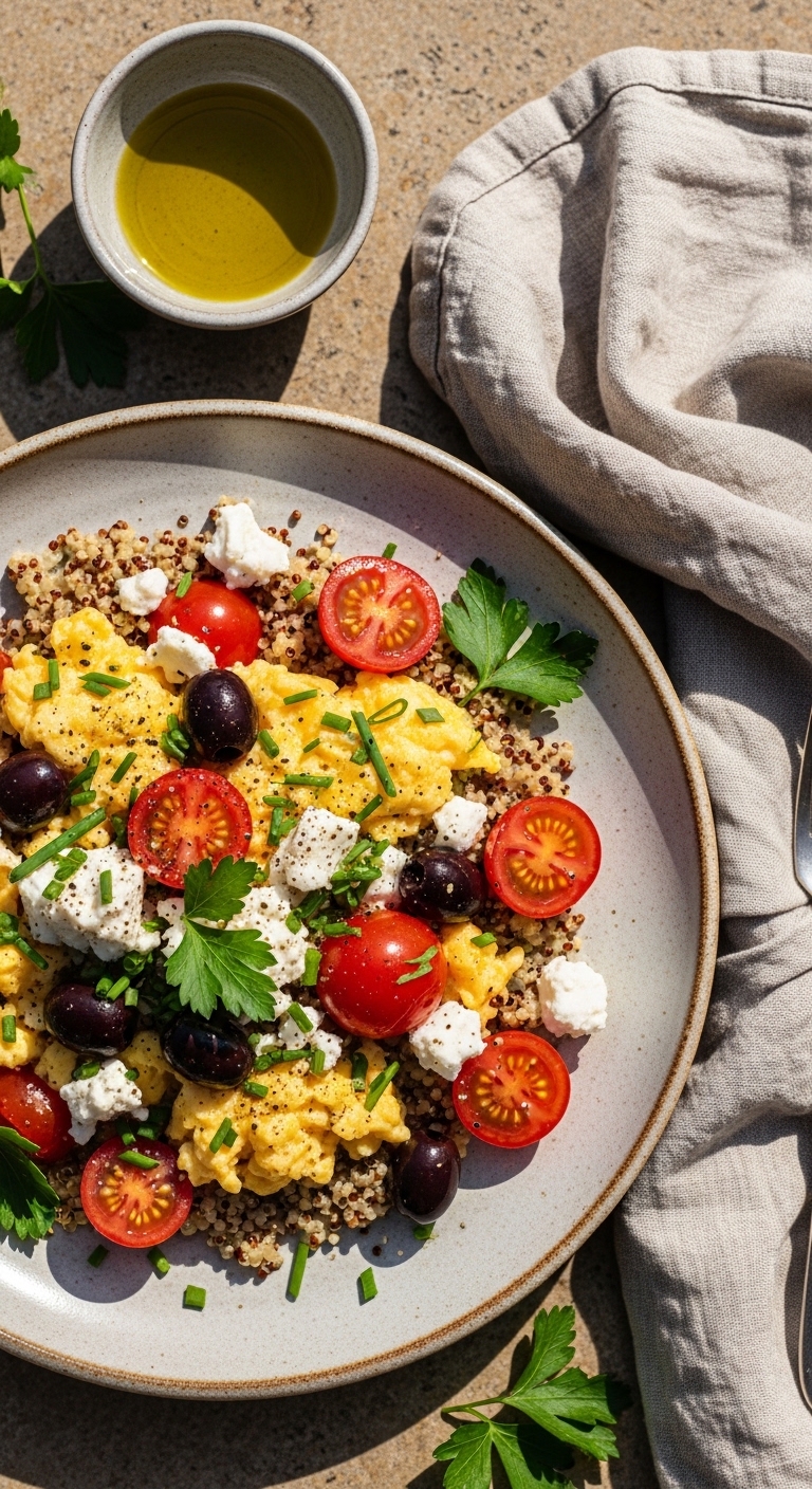 This protein-rich scramble combines quinoa and eggs for a double-hit of protein and texture. You get fluffy quinoa, soft curds of egg, and bursts of tomato and olive. It’s a bright, savory breakfast that supports muscle repair and keeps you full. You’ll like the nutty quinoa and salty feta contrast.