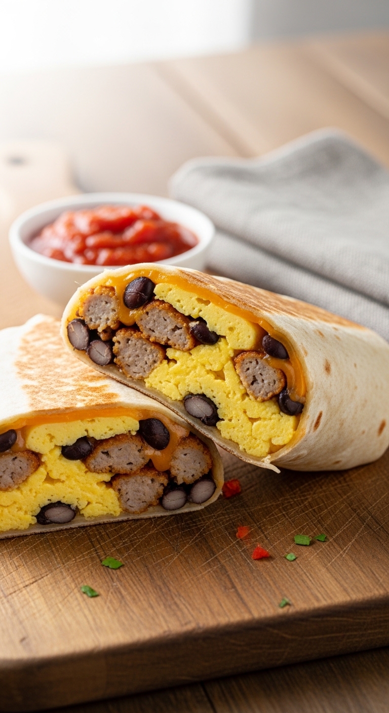 This breakfast burrito stacks lean turkey sausage and eggs for big protein in a handheld form. Texture mixes fluffy eggs, slightly crisp sausage, and melty cheese. It’s portable and filling, ideal for early gym sessions. You’ll love the smoky sausage notes and tangy salsa contrast.