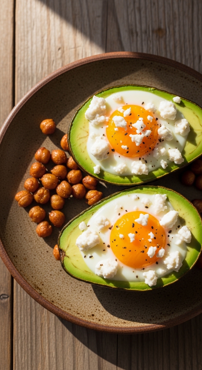 This baked avocado dish adds roasted chickpeas for crunch and extra protein. The texture contrasts creamy avocado, gooey yolk, and crisp chickpeas. It’s a simple, nutrient-dense breakfast that fuels muscle growth. You’ll notice the warm, nutty aroma from roasted chickpeas and lemon zest.