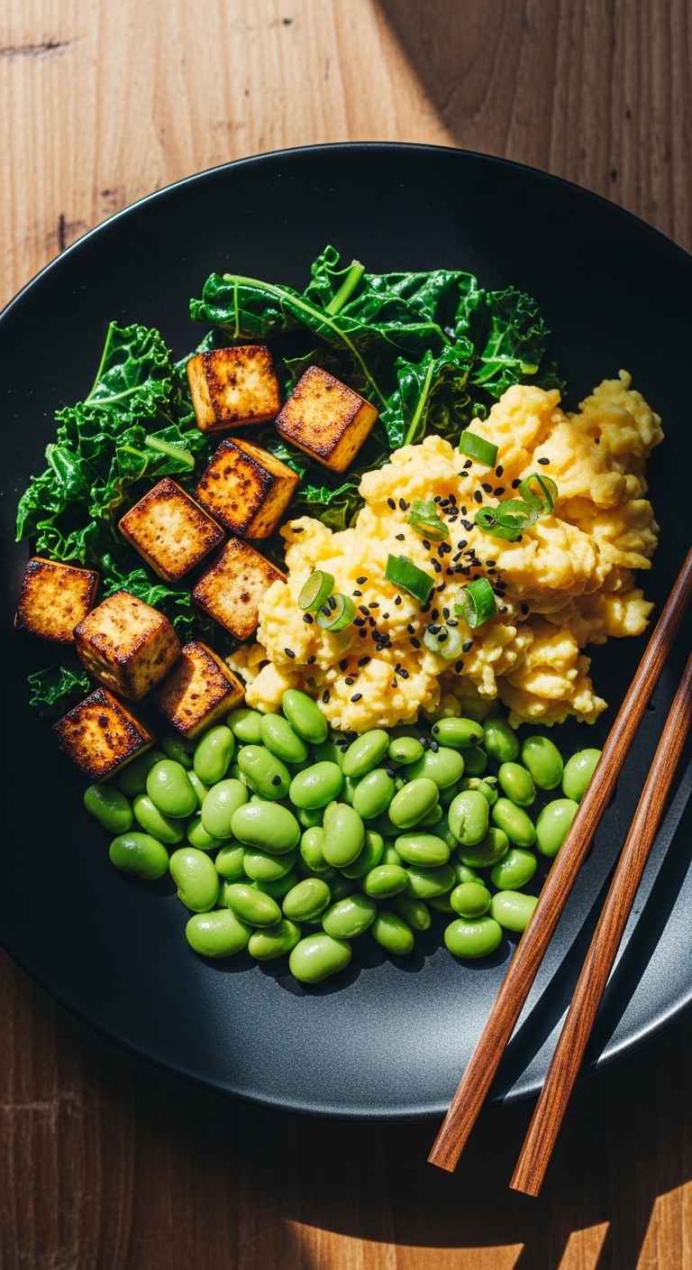 This hybrid scramble blends eggs with smoked tofu for an extra protein punch. The texture is hearty with chewy tofu and tender egg curds. It’s smoky, savory, and green from kale and edamame. You’ll like the umami depth and bold, satisfying flavors.