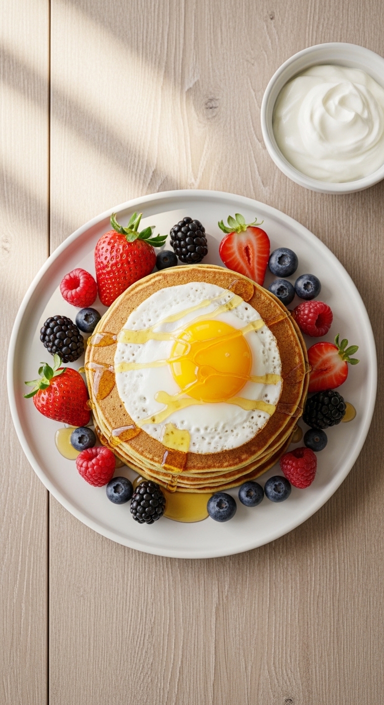 - Stack pancakes, top with a fried egg, 1 cup mixed berries, and a drizzle of honey.