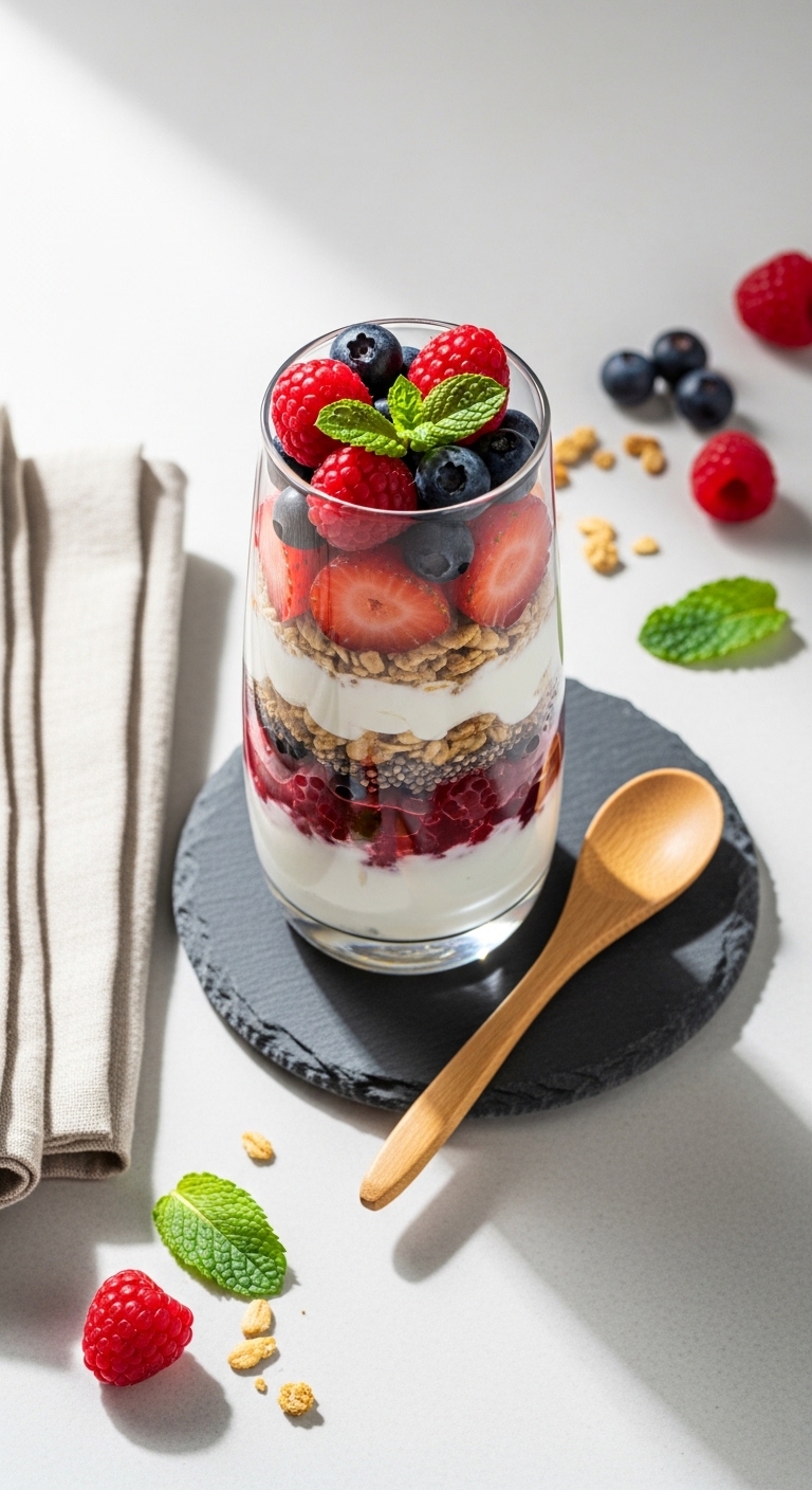 Serve in a clear glass to show layers. Garnish with a sprig of mint and a few whole berries. Pair with black coffee or green tea for a clean contrast. Store leftovers covered in the fridge up to 24 hours but keep granola separate. Make this parfait in jars for make-ahead breakfasts. Great for spring and summer brunch boards.