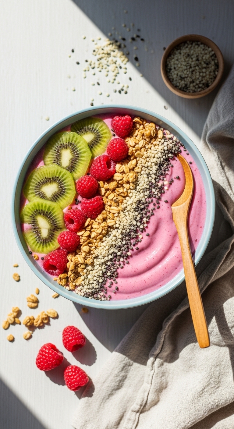 - Arrange granola, hemp seeds, kiwi slices, and raspberries on top.