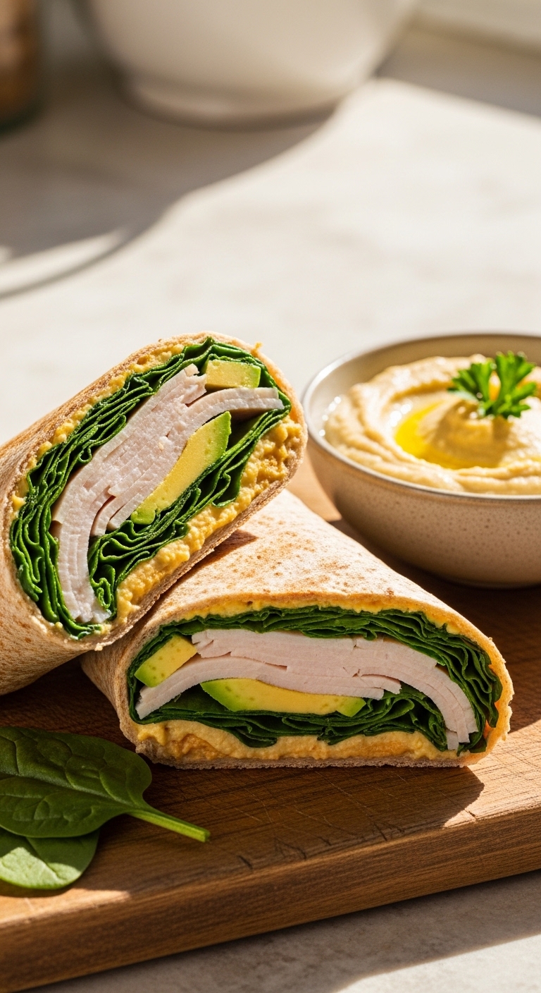 This wrap layers lean turkey, creamy hummus, and wilted spinach for a portable protein meal. The hummus keeps it moist without heavy sauces. Texture is soft with crunchy fresh veg.