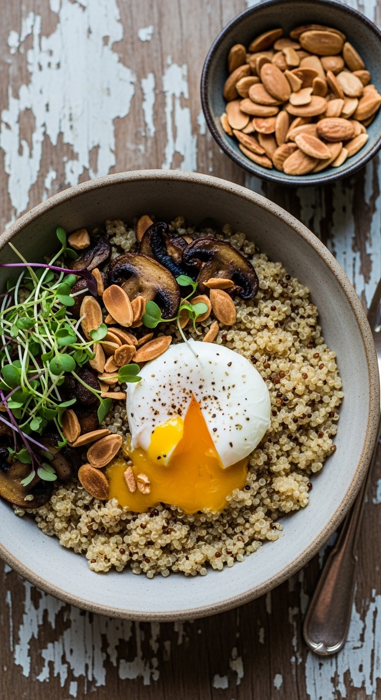 Quinoa adds nutty flavor and a full texture base for this bowl. The runny poached egg enriches each bite, while almonds add crunch. Earthy mushrooms deepen the savory profile.