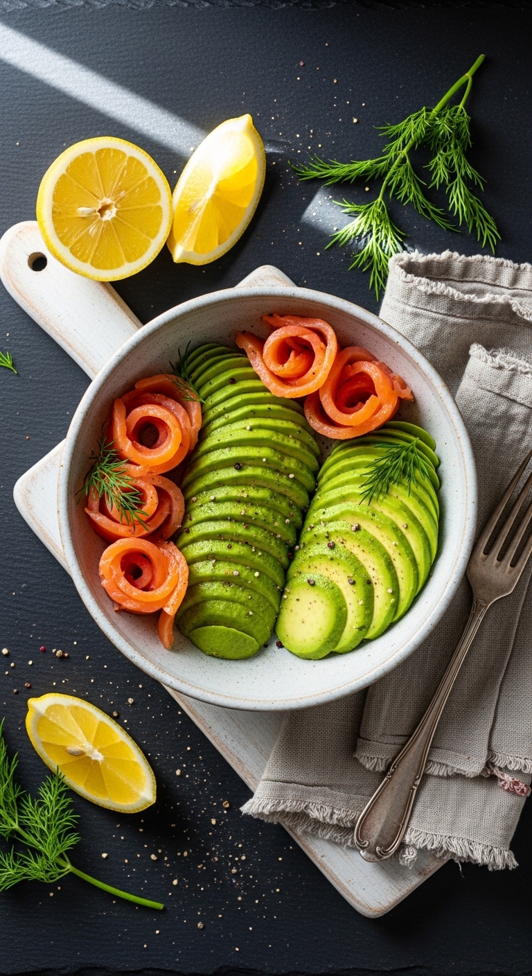 - Arrange avocado slices and smoked salmon in a bowl.