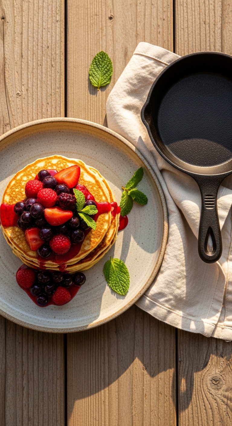 Stack two or three pancakes on a warm plate. Add a dollop of mascarpone or whipped cream sweetened with erythritol. Garnish with fresh mint and a few whole berries. Pair with strong coffee or a cinnamon latte. Store leftover compote in the fridge 3 days; pancakes freeze well in layers with parchment.