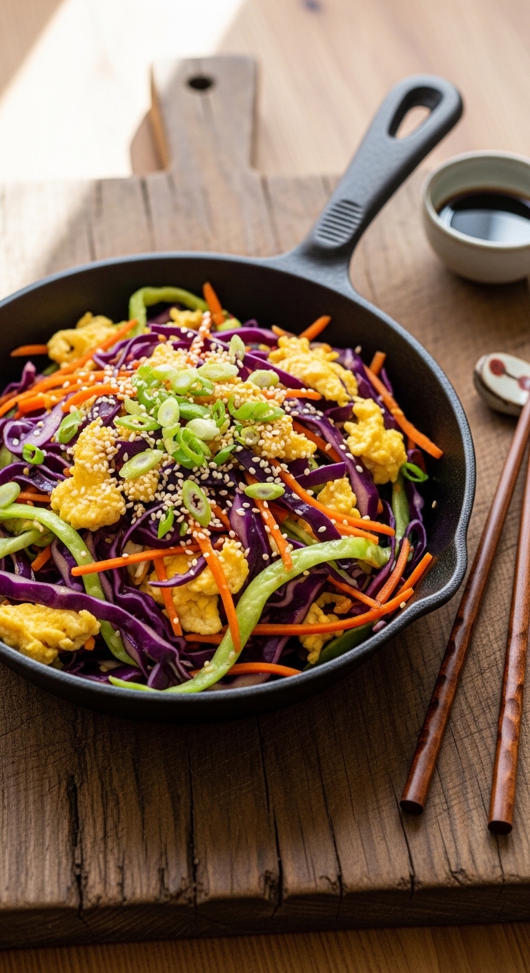 This breakfast bowl mimics egg roll flavors with none of the wrap carbs. It’s crunchy, savory, and bright with ginger and sesame. Eggs add protein and keep you full for hours. It works for weekday breakfasts and quick meal prep. The sesame aroma and crisp cabbage texture are particularly satisfying.