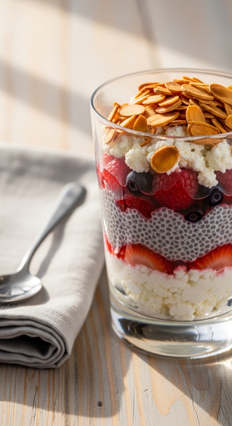 This parfait is creamy, slightly tangy, and lightly sweet. Cottage cheese gives protein and a velvety texture. Chia and berries add color and a jammy bite without excess carbs. It's quick to assemble and keeps well in the fridge. You’ll love the contrast of silky cheese and crunchy almonds.