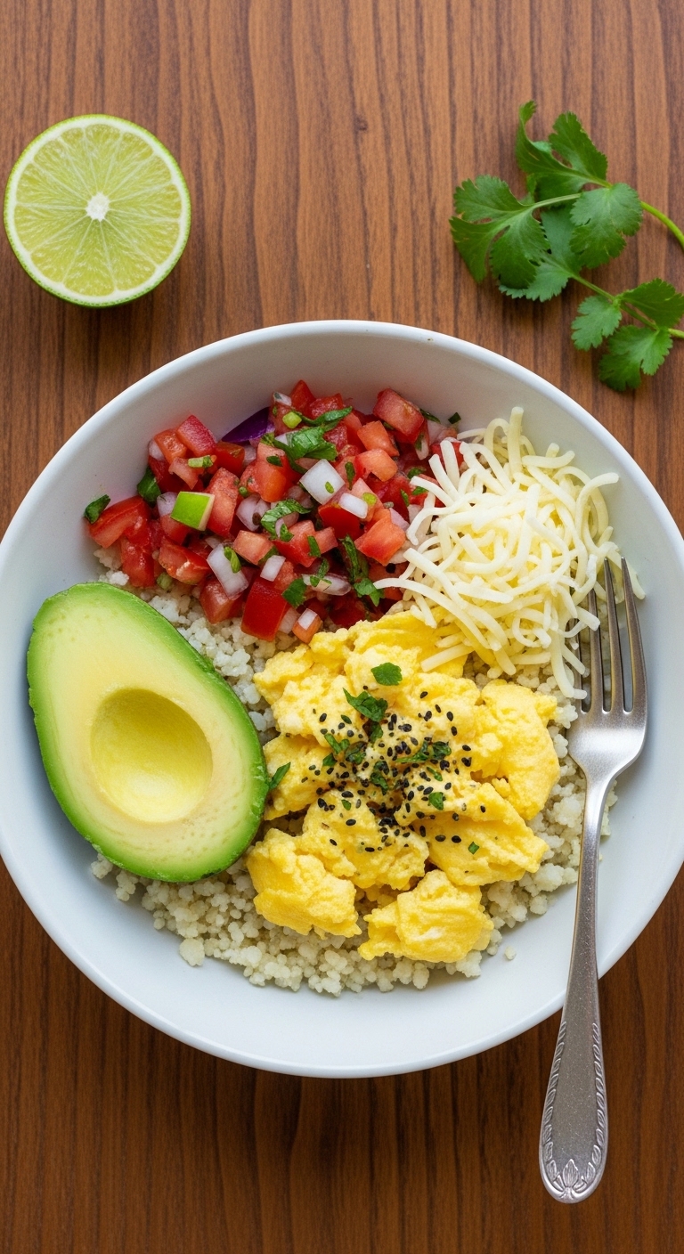 - Assemble bowls: place cauliflower rice base, top with scrambled eggs and cheese.