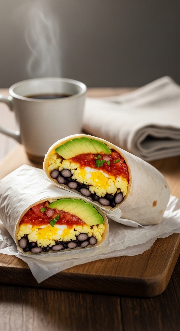 Cut burrito in half and serve with extra salsa, Greek yogurt, or hot sauce. Pair with fresh fruit or a green smoothie. If making ahead, leave avocado out and add fresh at serving to avoid browning. Store refrigerated up to 4 days or frozen up to 3 months. Great for busy mornings or road trips.