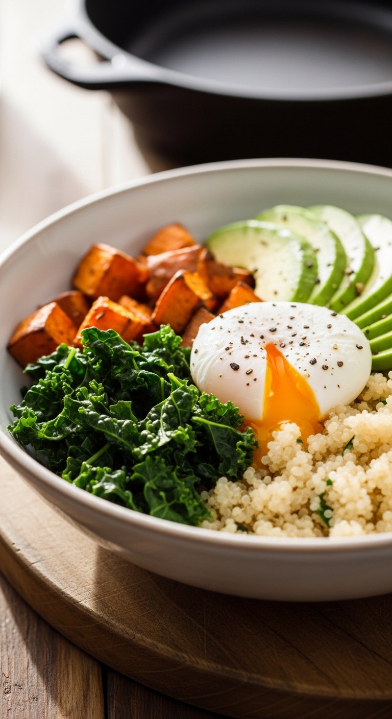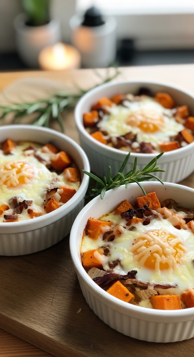 This baked skillet is hearty and colorful: roasted sweet potato, caramelized onion, and eggs baked until just set. The yolk can stay slightly runny for creaminess. It’s savory, slightly sweet, and satisfying.
