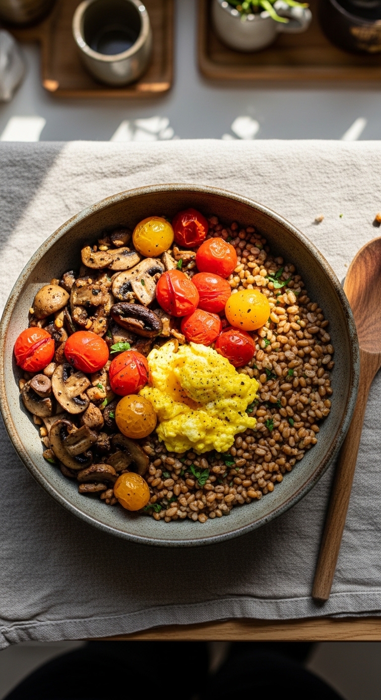 9. Savory Breakfast Grain Bowls: Farro, Mushrooms & Turmeric Eggs