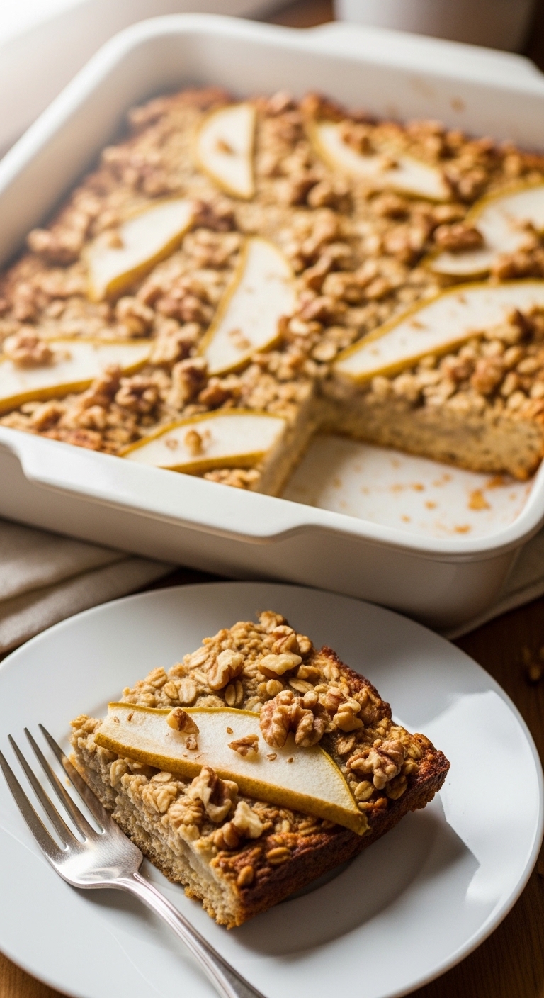 These baked oatmeal squares are soft, slightly caramelized, and nutty from walnuts. They slice neatly for weekday breakfasts. Pears add juicy sweetness and a tender texture.