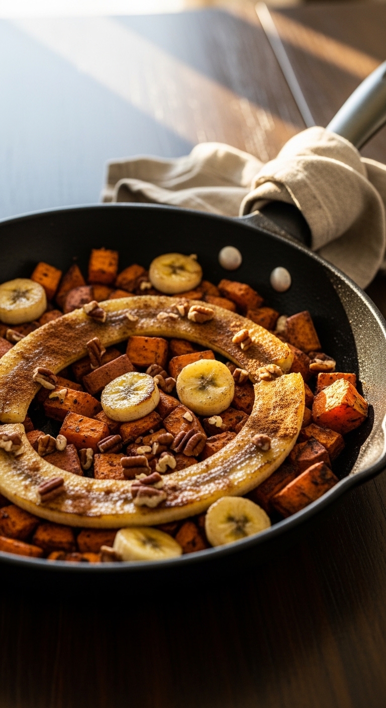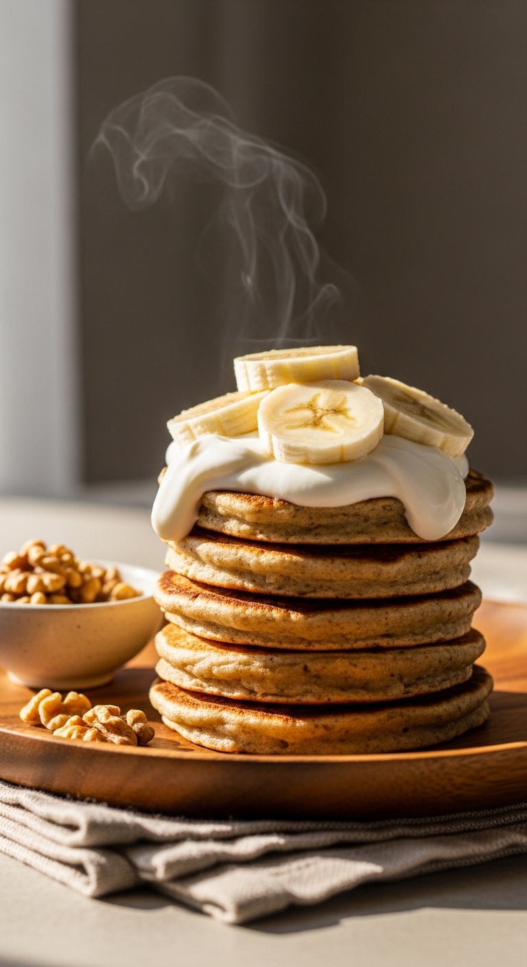 Stack pancakes on a warm plate. Top with yogurt, sliced banana, and chopped walnuts. Drizzle a tablespoon of almond butter if desired. Serve with a latte or a glass of cold brew. Make batter night before for faster mornings. Works well in fall or anytime you crave cozy breakfast flavors.