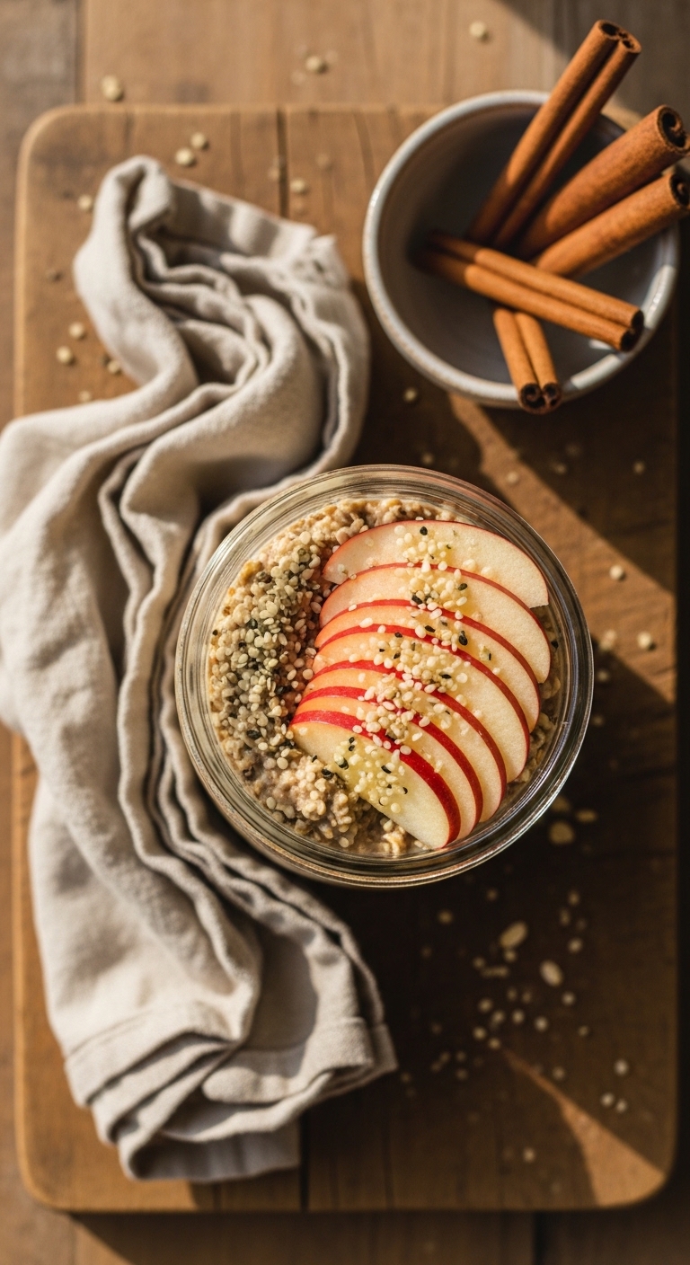 Serve in a glass jar to show layers. Garnish with a thin apple fan and a sprinkle of cinnamon. Pair with herbal tea or black coffee. Make several jars at once for weekday breakfasts. Great in autumn when apples are crisp and fresh.