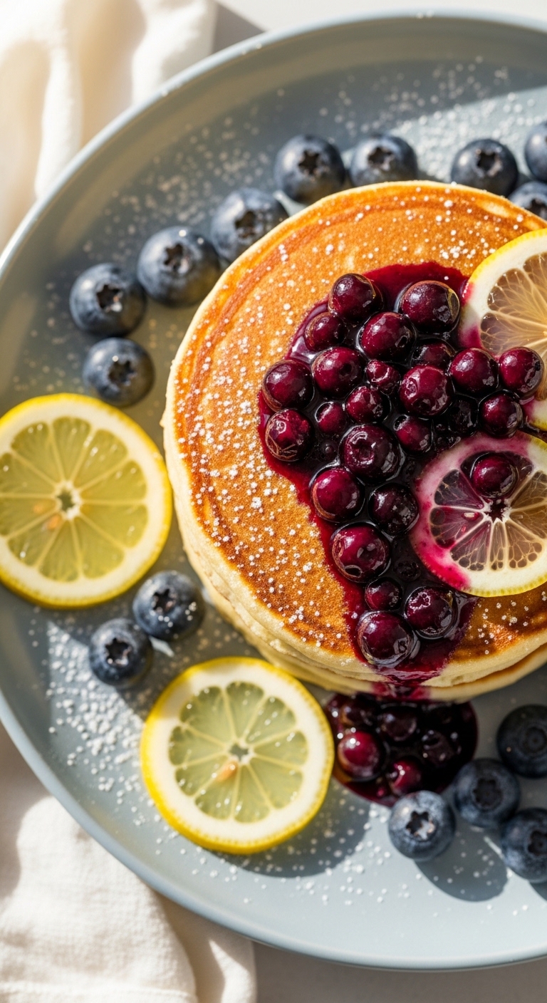 Stack and dust with lemon zest. Add a spoonful of ricotta and extra blueberry compote. Pair with tea or a mild coffee. Pancakes can be kept in the fridge and reheated on a griddle. Best for spring brunches or weekend treats.