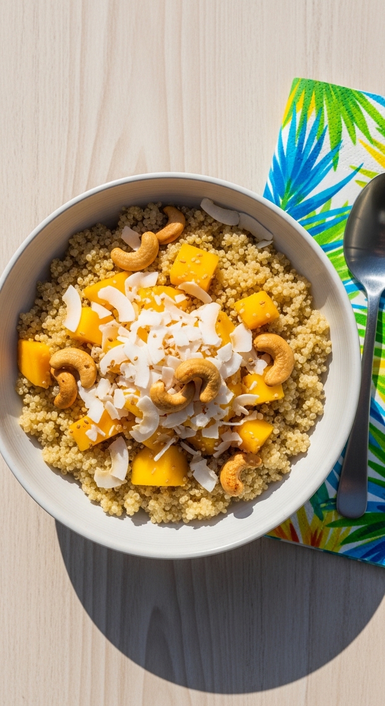Serve in a shallow bowl with a lime wedge. Garnish with extra coconut and a few mint leaves. Pair with iced tea or a simple espresso. Make quinoa ahead for speedy breakfasts. Great for hot-weather mornings and light brunches.