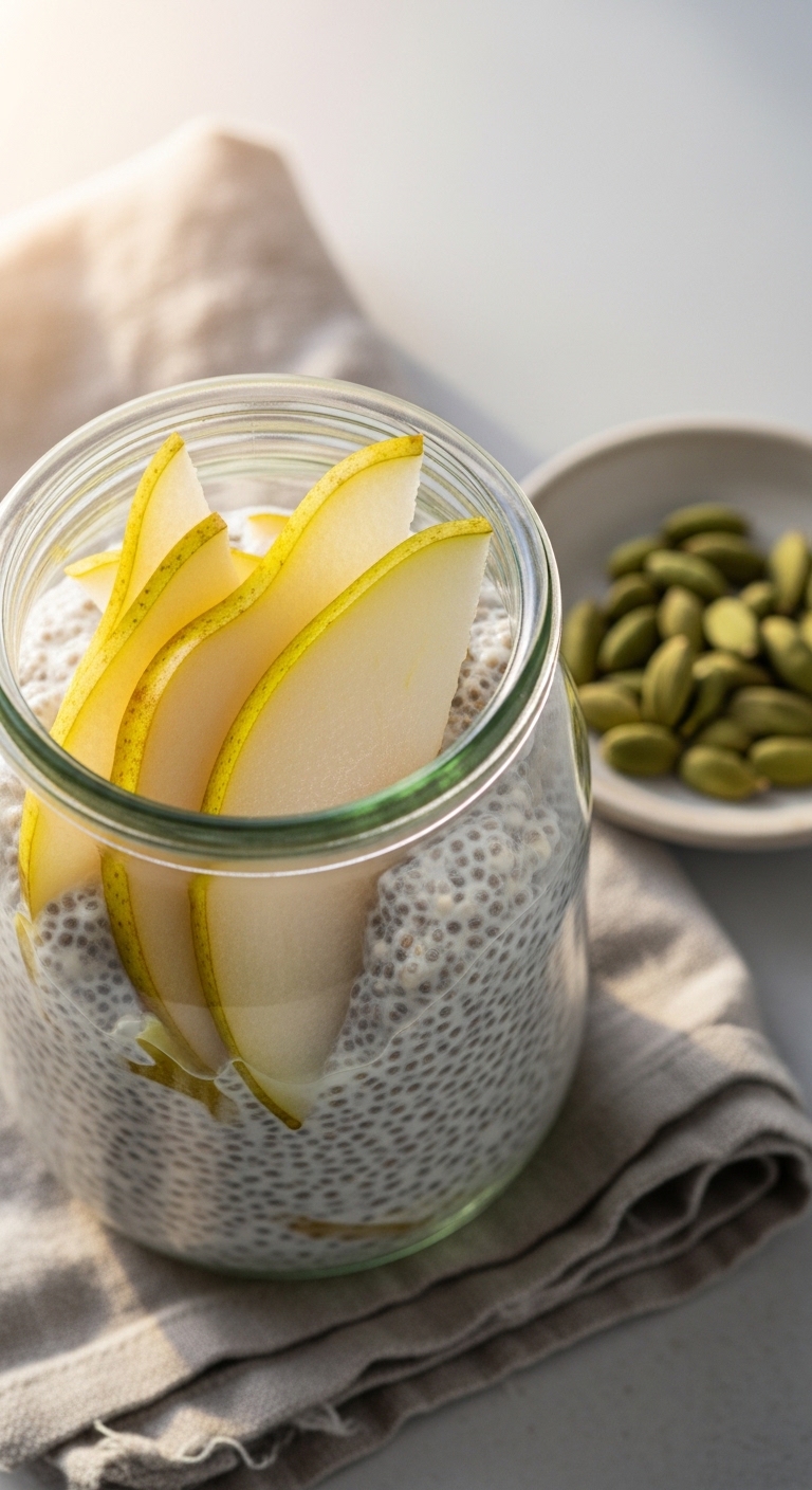 This pear-chia pudding is subtly spiced and silky. Cardamom pairs with vanilla for an aromatic profile. Chia seeds and Greek yogurt provide fiber and protein. It’s delicate but filling, perfect for a light morning. You’ll notice floral cardamom scent and soft pear flavor.