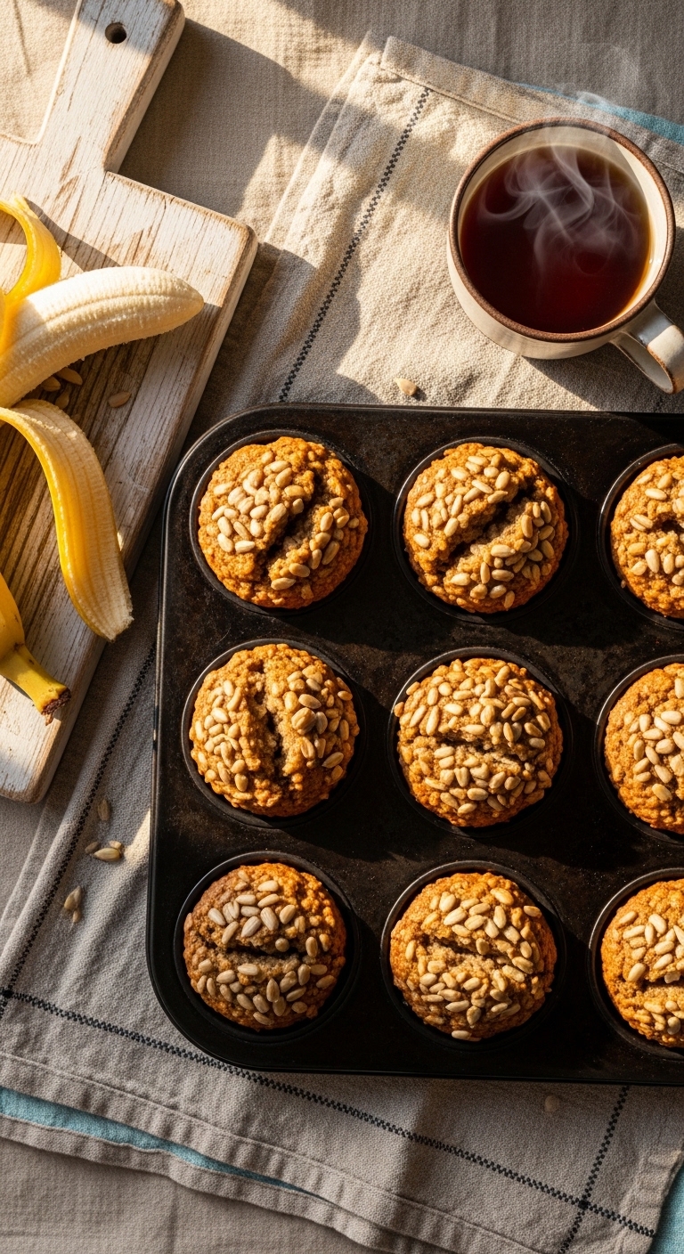 These muffins use mashed banana and oats for natural sweetness and fiber. Sunflower seeds add crunch and extra healthy fat. They’re moist, not overly sweet, and hold up well for on-the-go mornings. You’ll smell warm banana and oats as they cool.