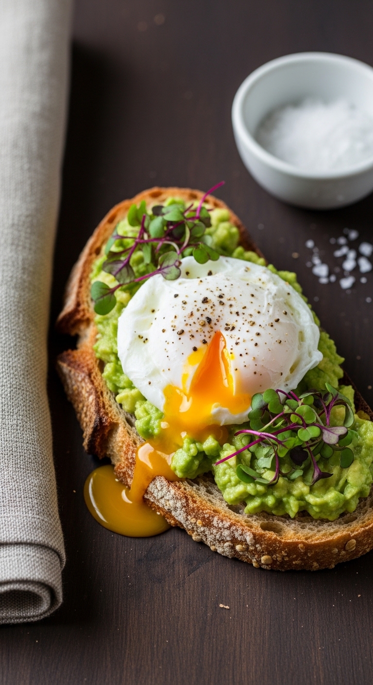 - Place poached egg on avocado toast. Season with pepper, red pepper flakes, and extra sea salt.