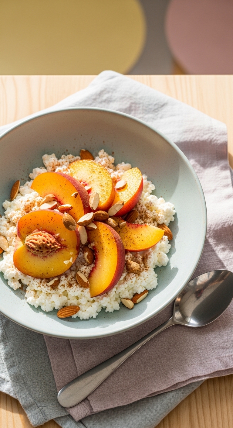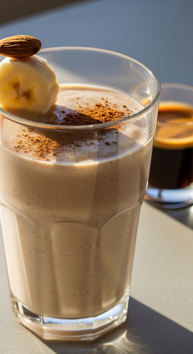 This banana almond smoothie has creamy banana, nutty almond flavor, and a subtle coffee kick. It’s high in potassium and offers moderate protein when you add Greek yogurt or protein powder. The coffee adds gentle alertness without extra calories. It’s quick, drinkable, and ideal when you’re short on time but need a filling, lower-calorie breakfast.