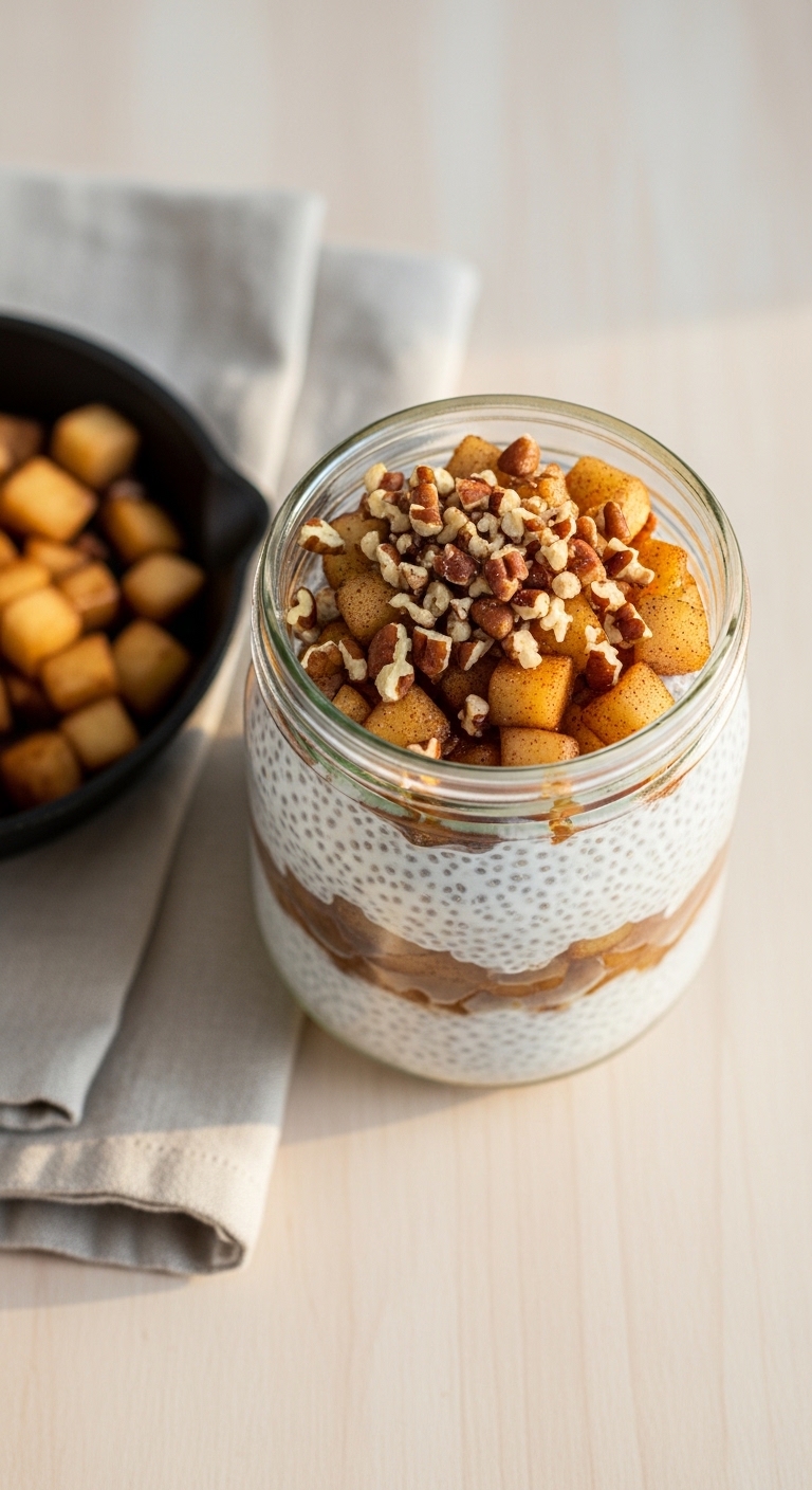 - Spoon chia pudding into a jar or bowl. Top with warm sautéed apples.