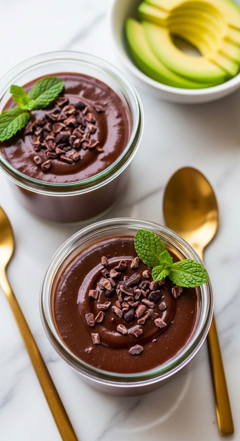 Serve in small glasses or ramekins topped with cocoa nibs, sliced strawberries, or toasted coconut. Pair with espresso or a mint tea. Store covered in the fridge up to 3 days (avocado will brown slightly; a squeeze of lemon or keeping an airtight film helps). Make ahead and keep chilled until serving.