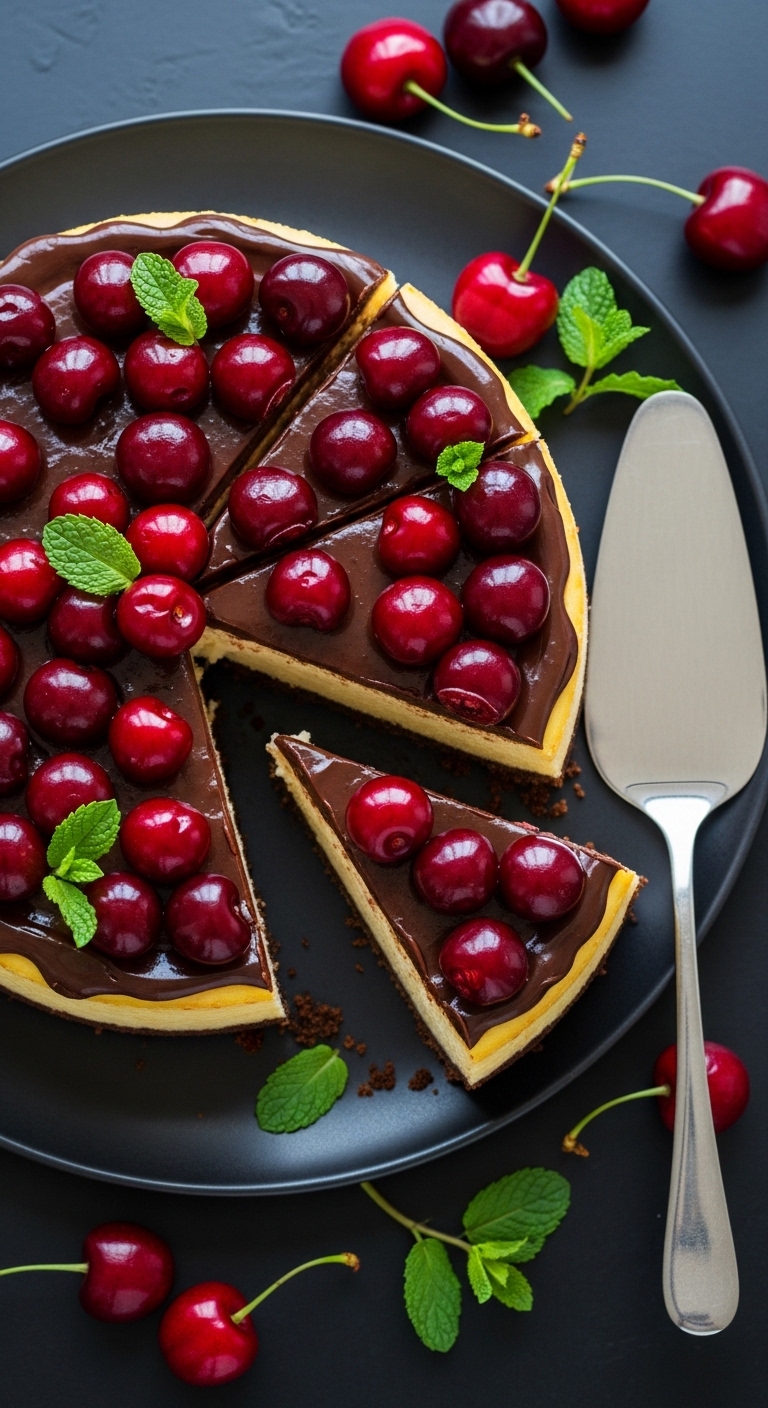 - For ganache, melt dark chocolate with cream and pour over chilled cheesecake. Top with remaining cherries.