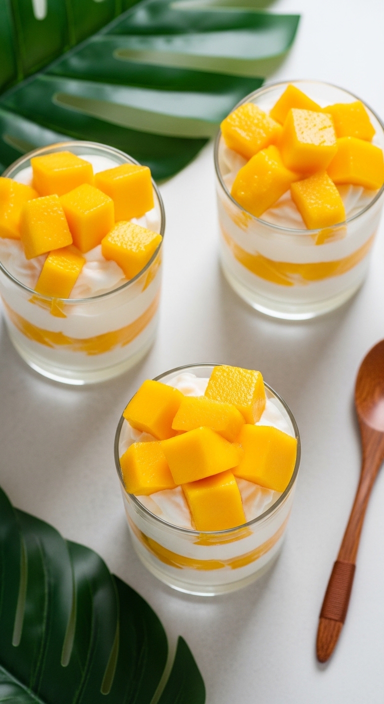 - Layer mango puree, coconut-protein cream, and toasted coconut into 4 small glasses.