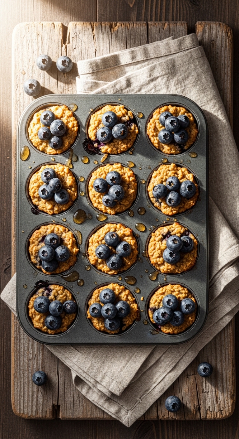 These baked oatmeal cups are portable, comforting, and packed with oats and protein powder. They’re lightly sweet and studded with juicy blueberries. The texture is cake-like yet hearty. You’ll love their warm oat aroma and tender crumb. They’re ideal for breakfast-dessert crossover treats.