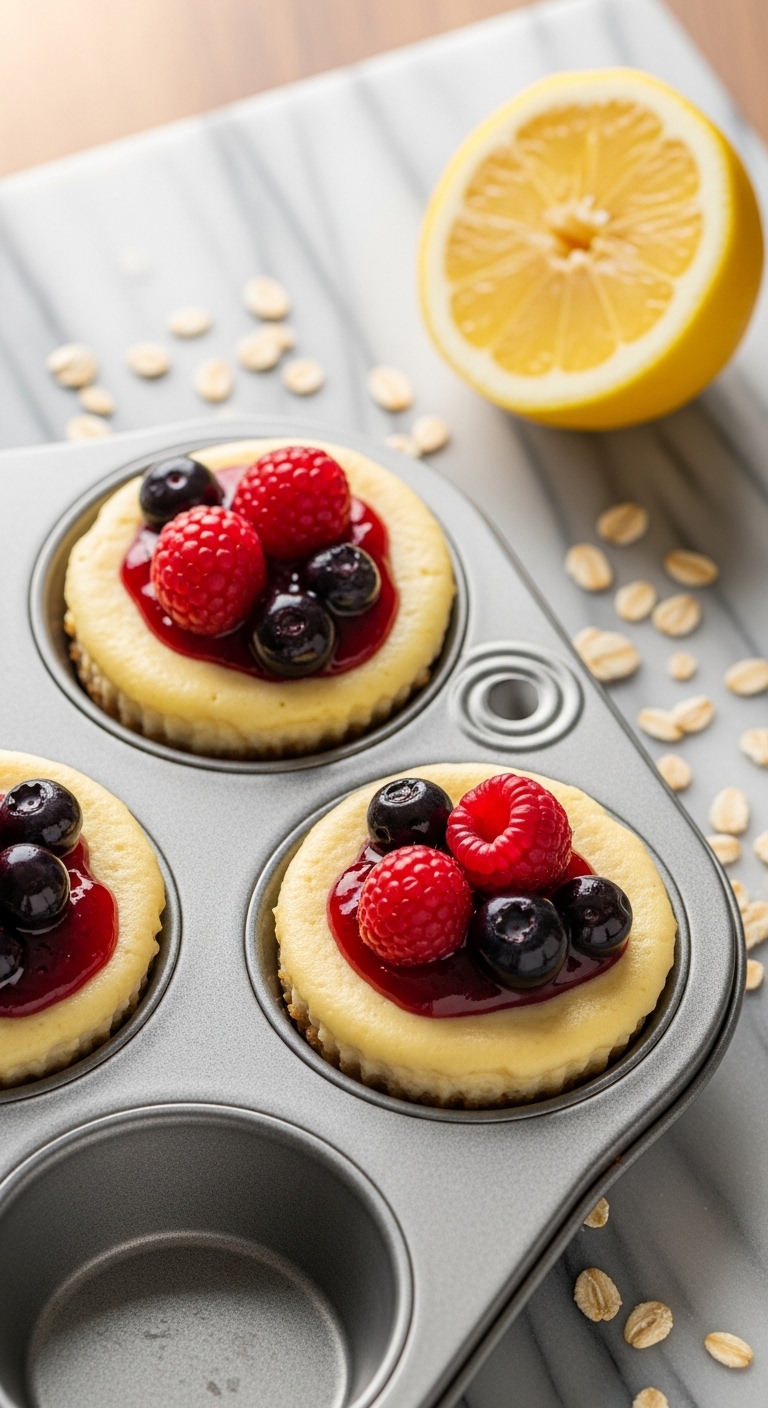 Top each mini cheesecake with berry compote and a few fresh berries. Garnish with lemon zest and mint. Store in the fridge for 3–4 days. Freeze without compote for up to 1 month; thaw in the fridge before serving. These are great for parties or portion-controlled treats.