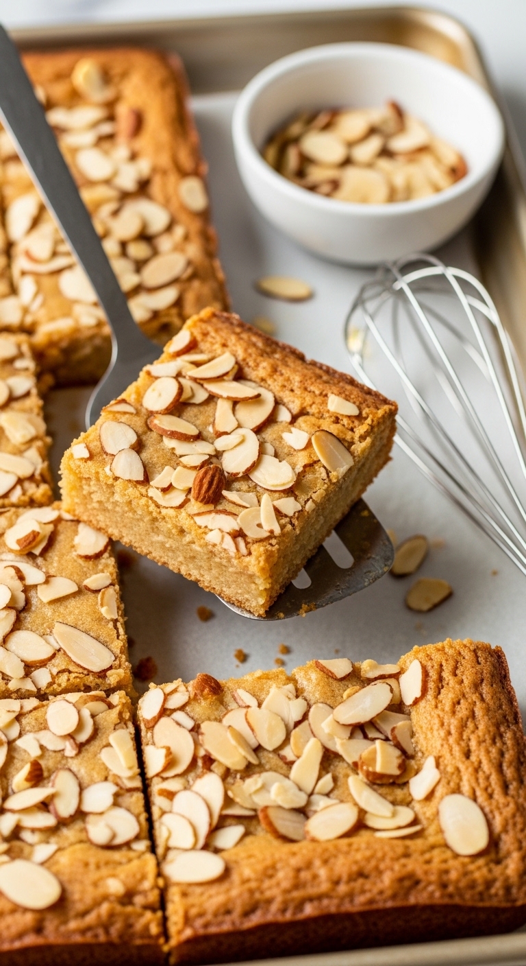 - Spread batter in pan and smooth. Top with 1/4 cup sliced almonds.