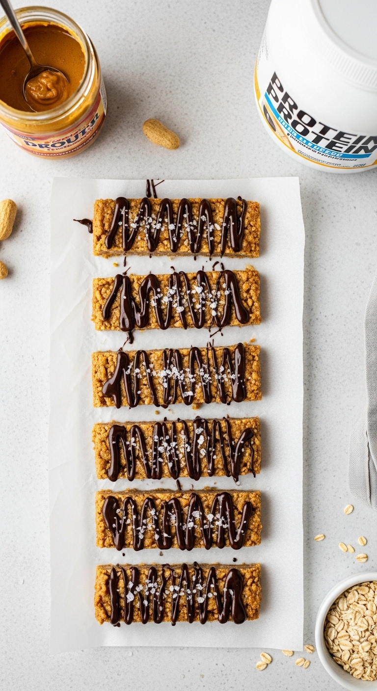 These bars come together in a food processor and set in the fridge—no oven required. They’re chewy, nutty, and dense with protein powder and oats. They make a great quick dessert on busy nights or a post-dinner snack. You’ll appreciate the peanut aroma and chocolate drizzle.