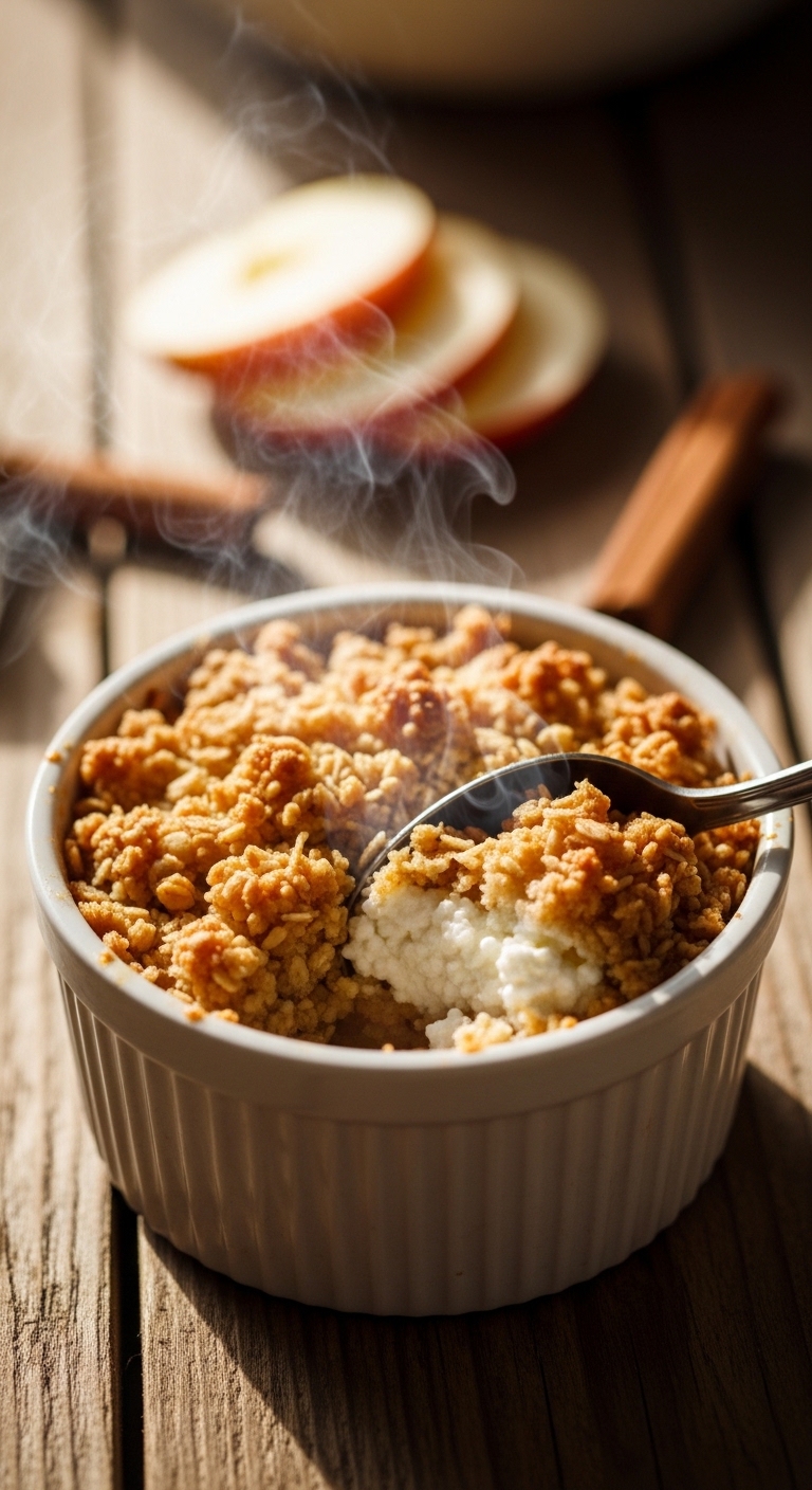 Serve warm with a dusting of cinnamon and a light dollop of Greek yogurt. Pair with a cup of chai tea. Store leftovers in the fridge up to 3 days; reheat briefly in the oven to crisp topping. Prep apple mixture ahead and bake when ready.