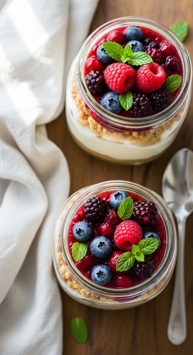 Serve chilled in the jars with a short dessert spoon. Top with extra berries or a dusting of cinnamon. Pairs well with iced green tea or a citrusy mocktail. Store covered in the fridge for up to 3 days. Make ahead and keep sealed for picnic transport.