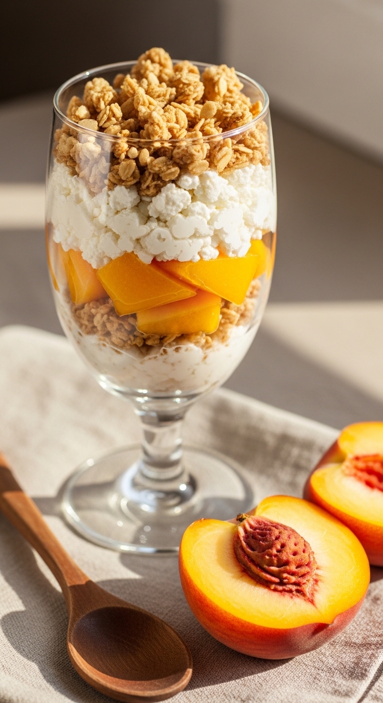 This parfait is bright and fresh with creamy cottage cheese and juicy peaches. Cottage cheese adds a high-protein base without baking. Honey granola gives toasted crunch. It’s effortless for brunch, breakfast, or a light dessert. You’ll enjoy the warm peach scent and creamy contrast.