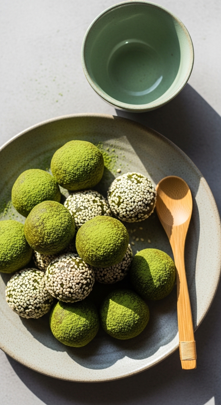 Matcha gives these bites a subtle grassy flavor and an energizing caffeine lift. White bean or almond butter forms a smooth base while protein powder boosts nutrition. They’re small, bright, and perfect for an afternoon pick-me-up. Expect a slightly earthy taste with a sweet finish.