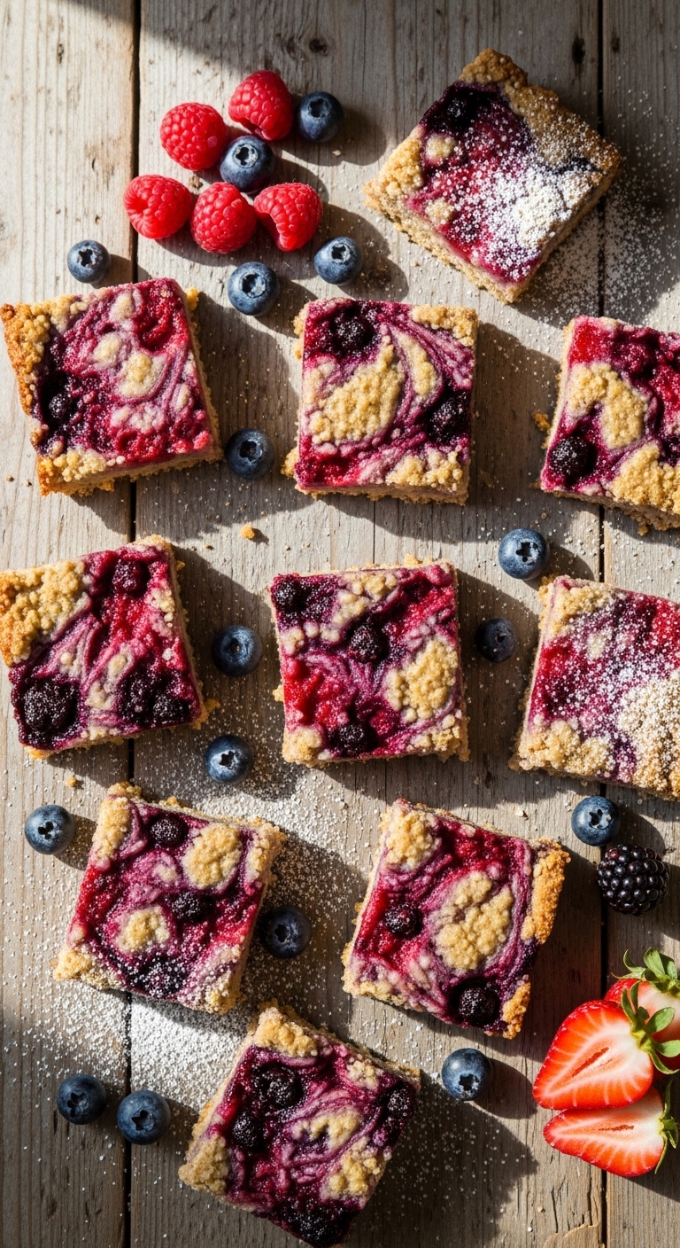 These squares pair hearty oats with tangy berry swirls. They’re chewy and slightly jammy, with protein powder folded into the base. Great for picnics, potlucks, or a fruity summer dessert. You’ll notice warm oat aroma and tart berry bursts.