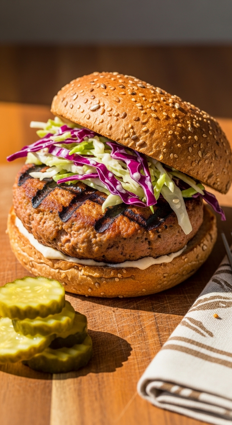 This lean turkey burger gets flavor from a smoky BBQ glaze and crisp slaw. Protein from turkey keeps you full without heaviness. The contrast of warm patty and crunchy slaw is satisfying. Ideal for backyard lunches or packed dinners.
