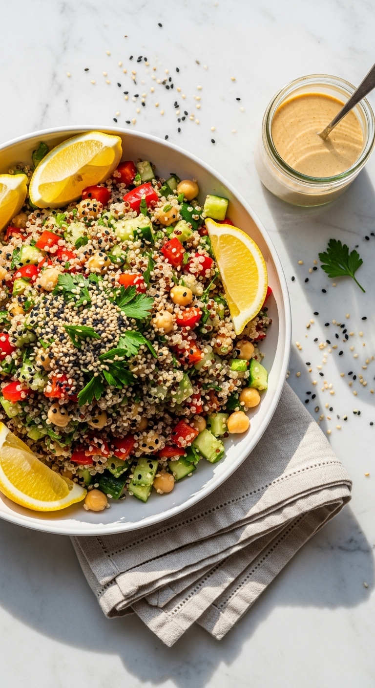12. Quinoa & Edamame Protein Salad with Lemon Tahini Dressing