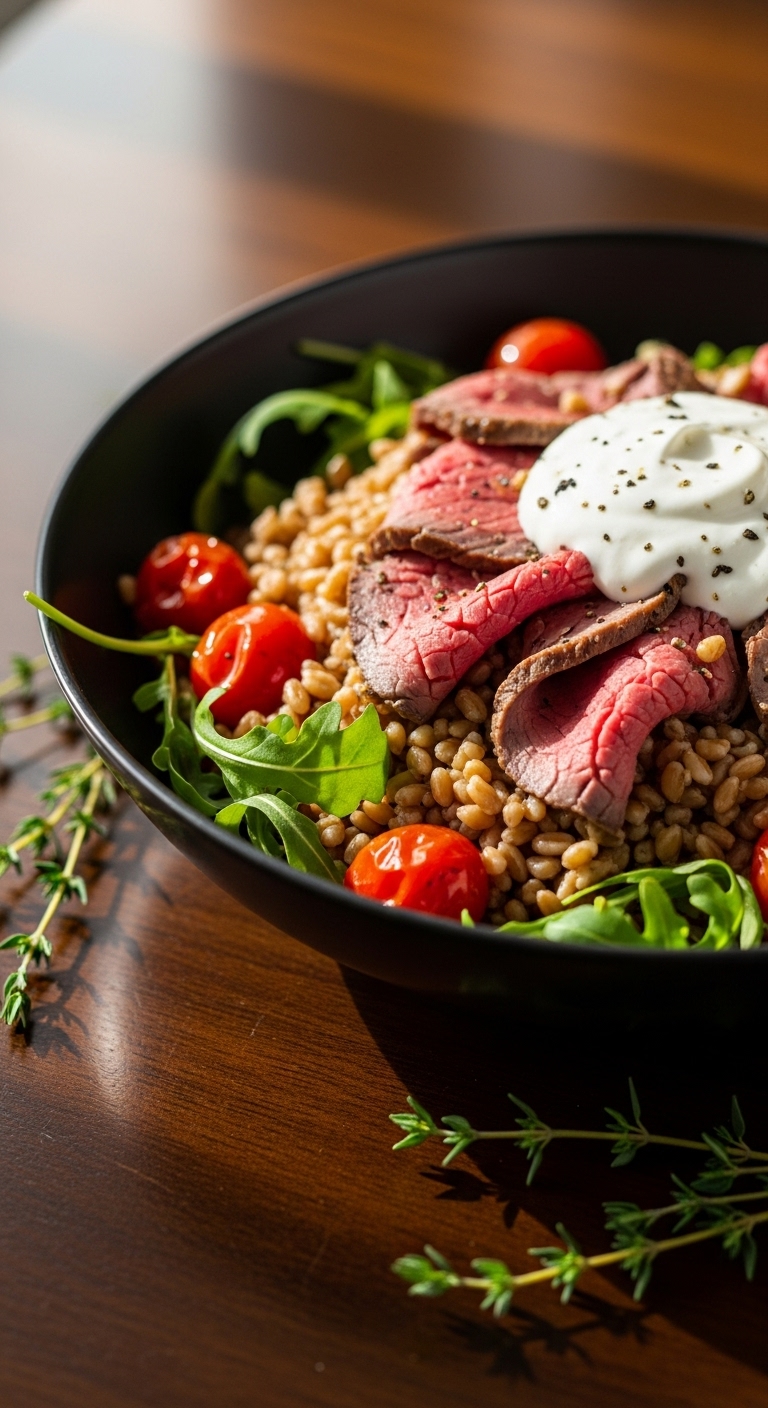14. Warm Farro Bowl with Roast Beef and Horseradish Yogurt
