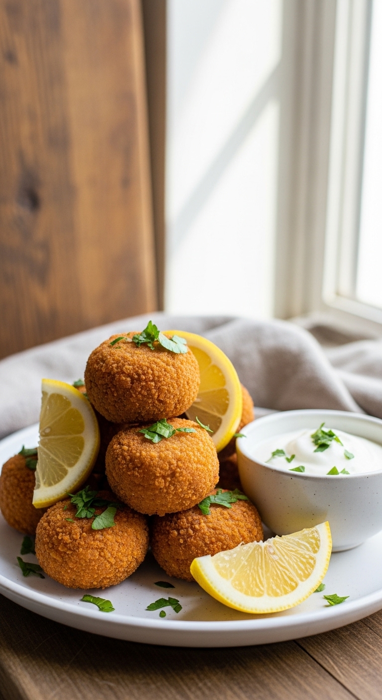 Serve warm with a lemony yogurt dip and extra herbs. Garnish with lemon wedges and a drizzle of olive oil. Pair with crisp cucumber slices or whole-grain crackers. Store in the fridge for 3–4 days in an airtight container. Reheat in a hot oven for crisp edges.