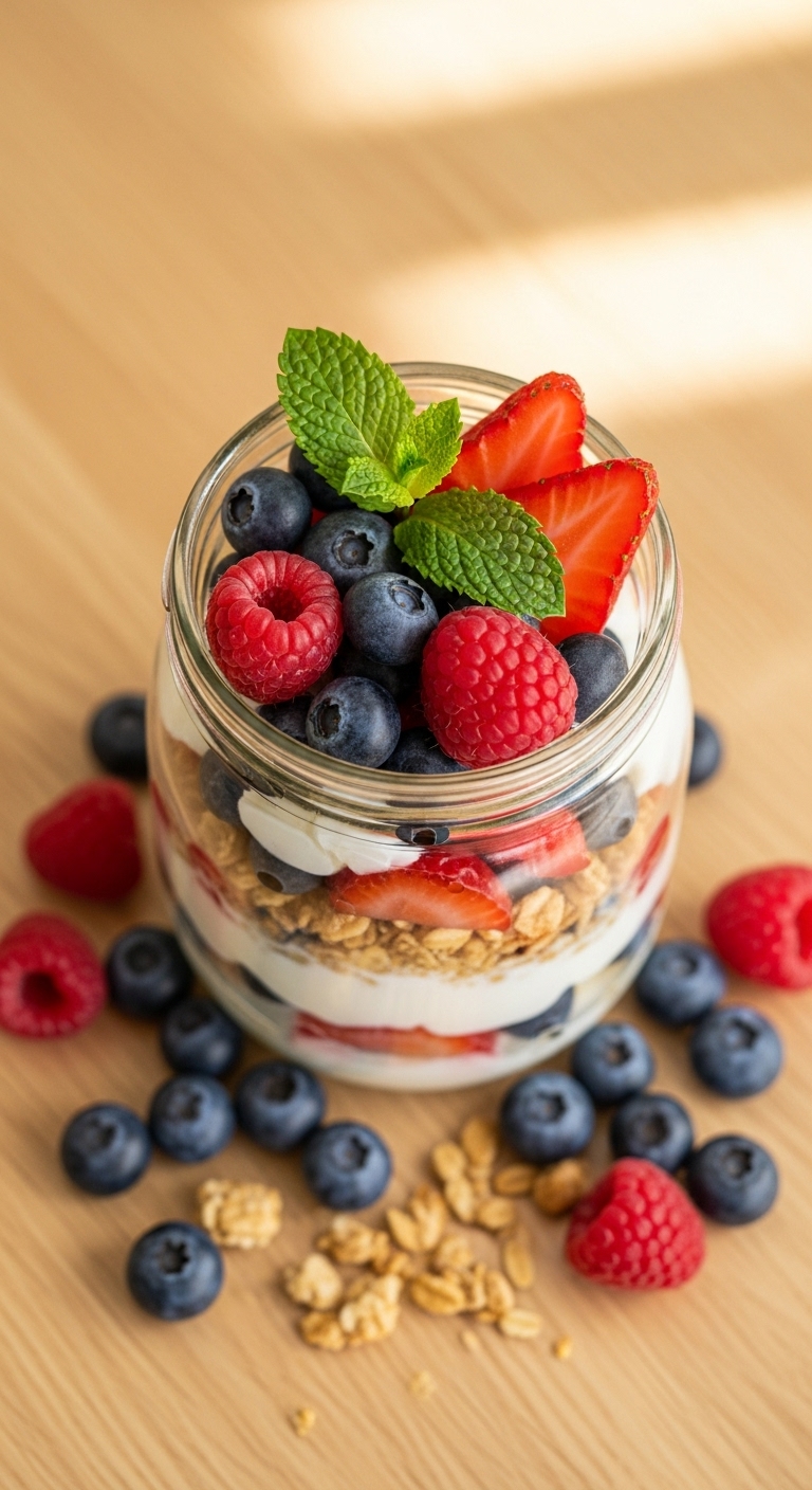 Serve in a clear jar to show layers. Garnish with a mint sprig and extra berries. Pair with a small espresso or herbal tea. Keep granola separate if packing for later. Store jars in the fridge for 24 hours. Make ahead for breakfasts or gym snacks.