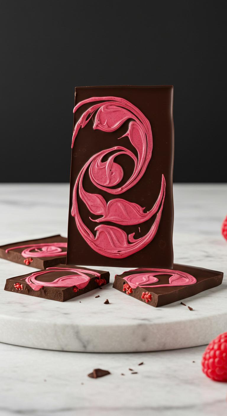 - Pour dark chocolate onto parchment and swirl in white chocolate and raspberry puree.