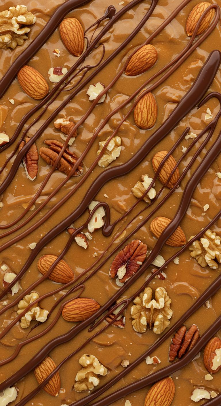 - Sprinkle toffee bits and nuts over the top, pressing down slightly.