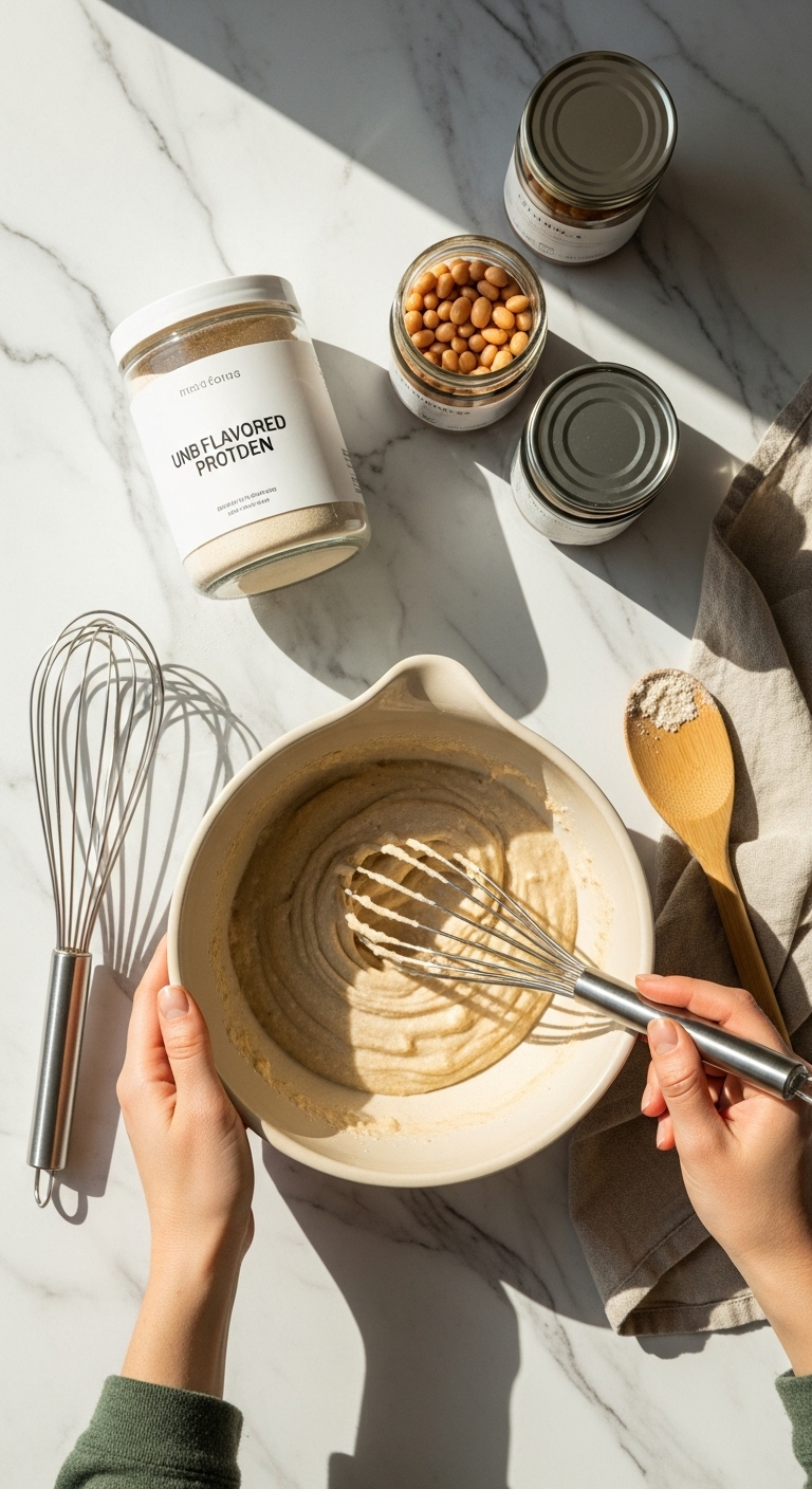 - Mix 1–2 tbsp unflavored protein powder into batters, soups, or pancake mix.