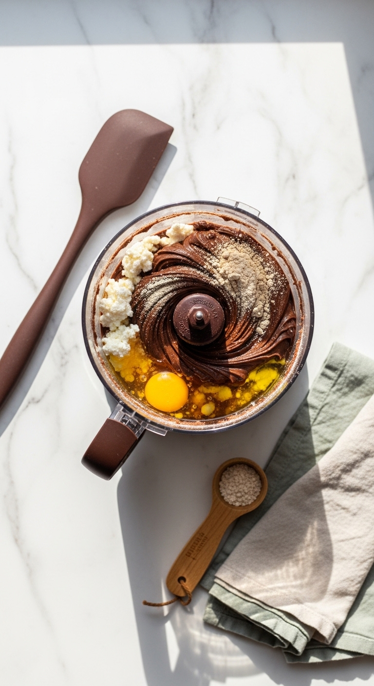 - Add the dry mix (protein powder, cocoa, baking powder, salt) and pulse until combined. Scrape sides with a spatula.