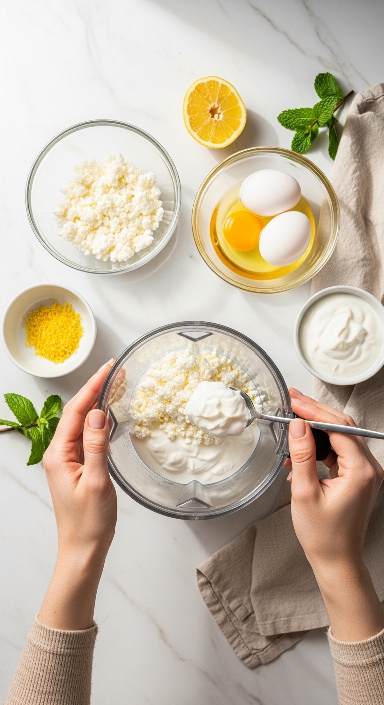 - In a blender or food processor, combine cottage cheese, Greek yogurt, eggs, sugar, cornstarch, vanilla, lemon zest, and pinch of salt.